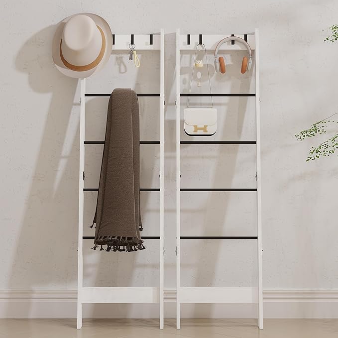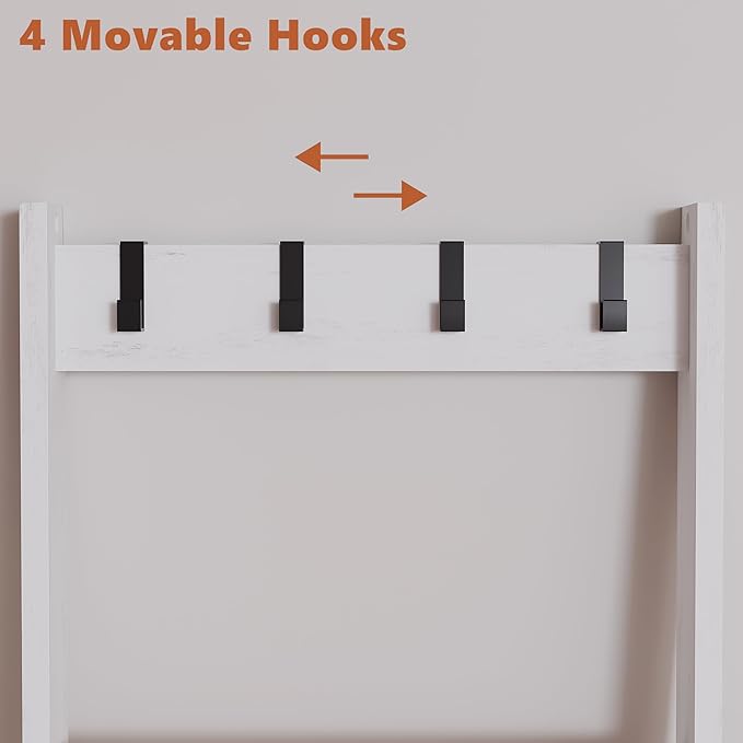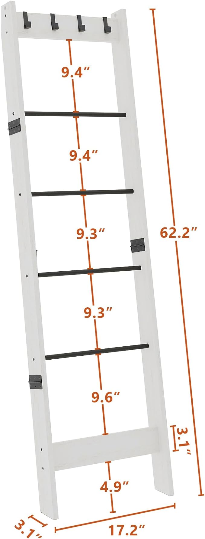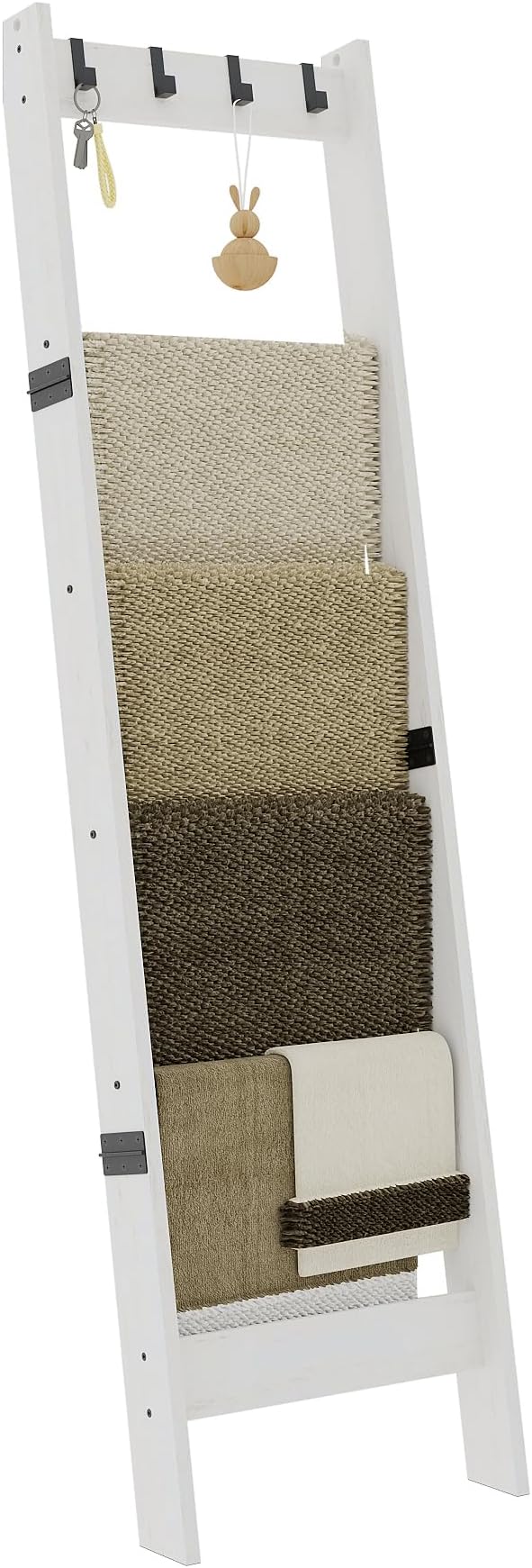 6 Tier Blanket Ladder Shelf for Living Room and Bedroom, Ladder Holder with 4 Metal Hooks, 5.2ft Blanket Quilt Holder Rack, Farmhouse Ladder Rack for Storage and Home Decor, White