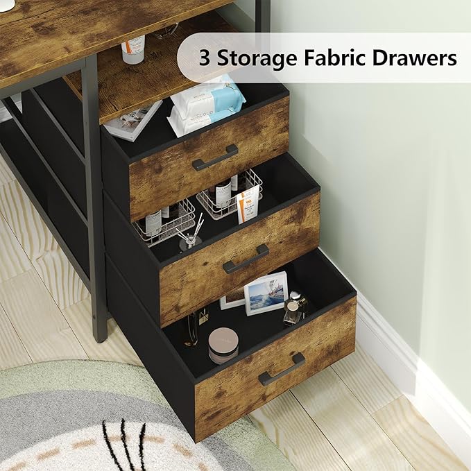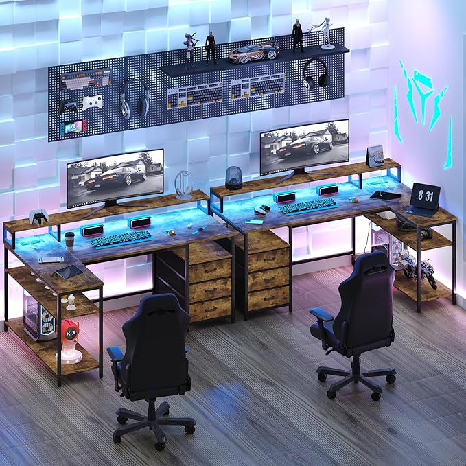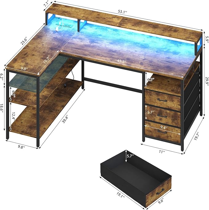 L Shaped Desk with 3 Drawer & 3 Open Shelf, Computer Desk with LED Lights & Power Outlets, Home Office Desk with Reversible Storage Shelves & Monitor Stand, Corner Desk for Small Space