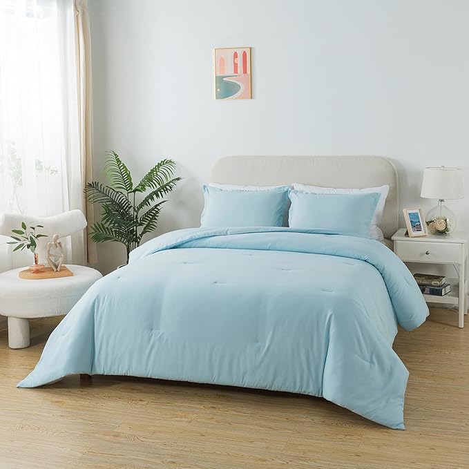 Baby Blue Comforter Set Twin Size, Solid Lightweight Down Alternative Soft Boho Bedding Comforter Set, Breathable Fluffy Microfiber Skin-friendly Comforter (68"x90") for All Seasons