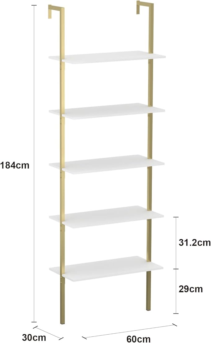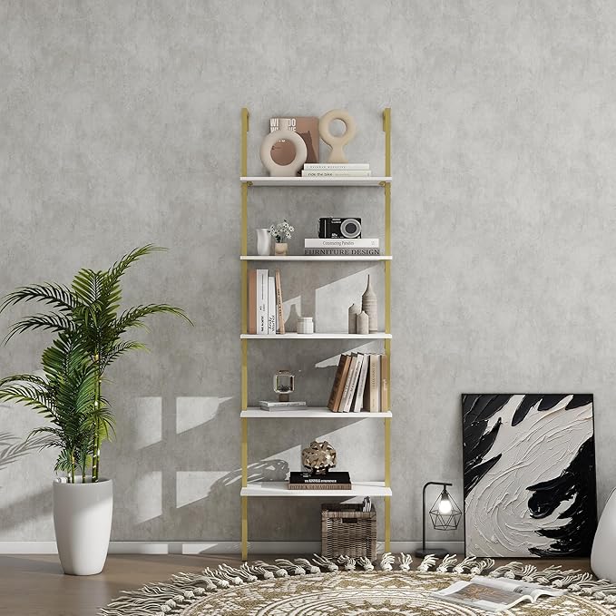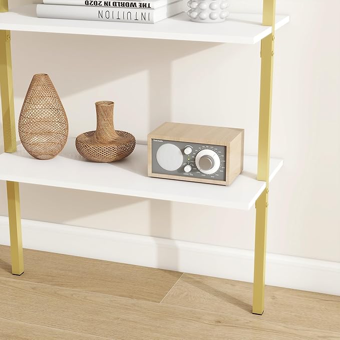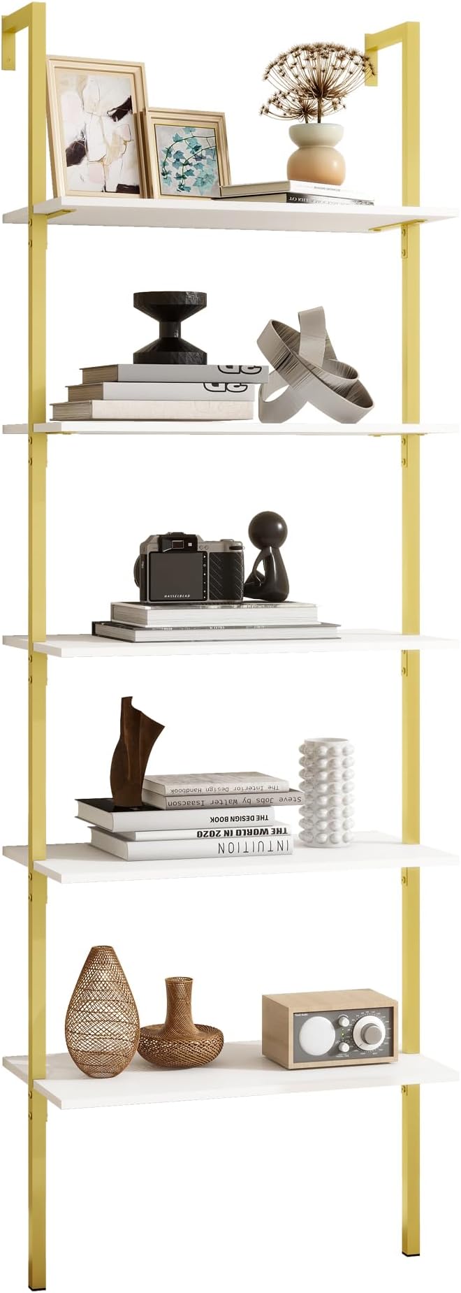 Panana Industrial 5 Tier Ladder Shelf, Open Space Book Shelf Wall Mount Bookshelf with Metal Frame Sturdy Bookcase for Living Room (White, 5 Tier)