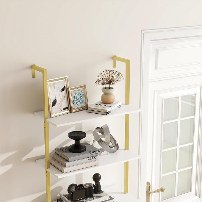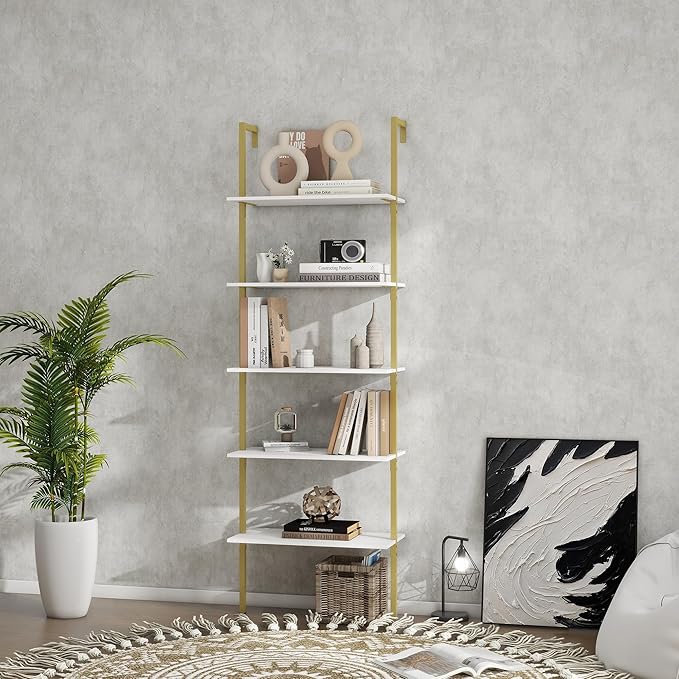 Panana Industrial 5 Tier Ladder Shelf, Open Space Book Shelf Wall Mount Bookshelf with Metal Frame Sturdy Bookcase for Living Room (White, 5 Tier)