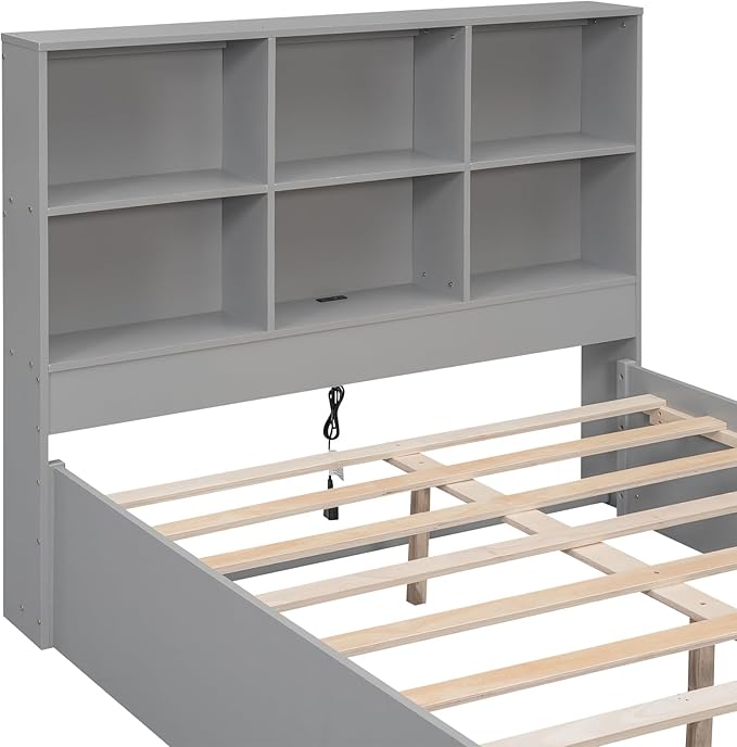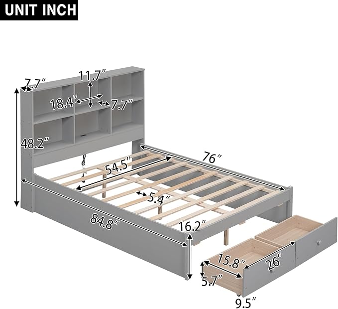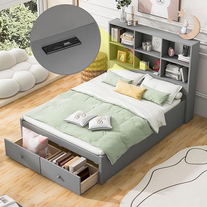 Full Size Platform Bed with Storage Headboard Bookcase, 2 Drawers Underneath and Charging Station, for Bedroom/Guest Room, Gray