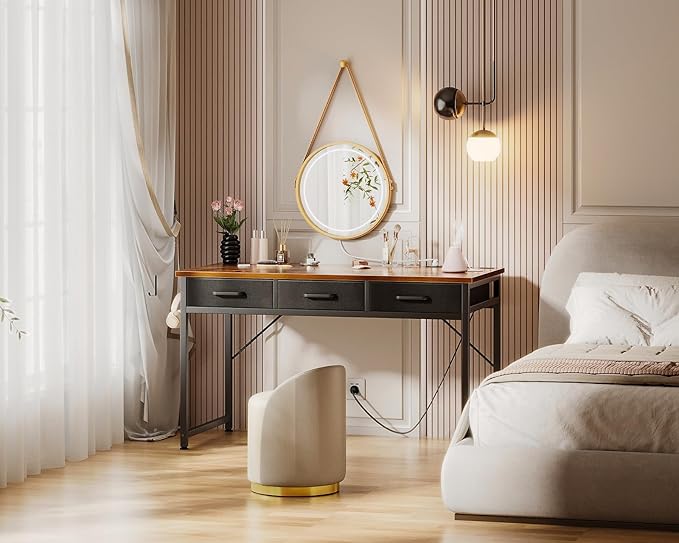 AODK 48 Inch Computer Desk with 3 Fabric Drawers, Office Desk with USB/Type-C Charging Ports & Power Outlets, Vanity Desk with Iron Hook for Bedroom, Study/Writing/Work Table for Bedroom,Vintage