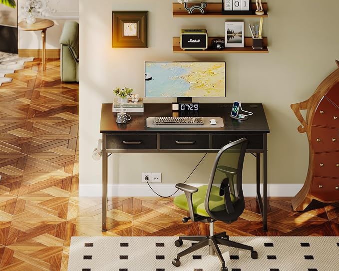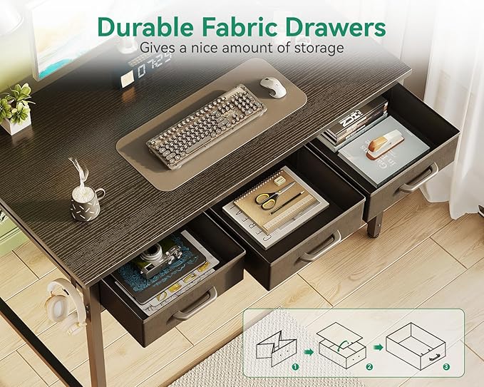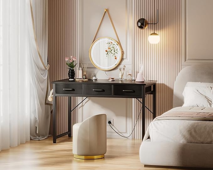 AODK 40 Inch Small Computer Desk with 3 Fabric Drawers, Office Desk with USB/Type-C Charging Ports & Power Outlets, Vanity Desk with Iron Hook for Bedroom, Study/Writing/Work Table for Bedroom, Black
