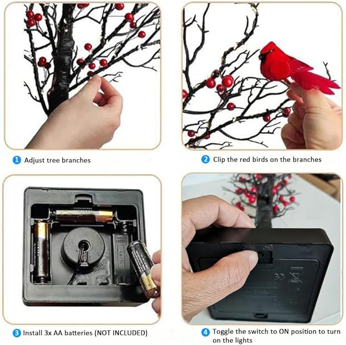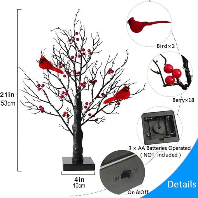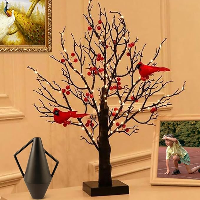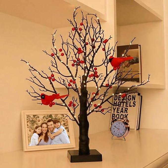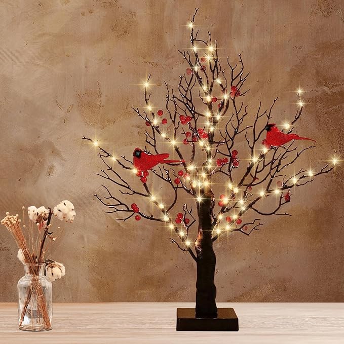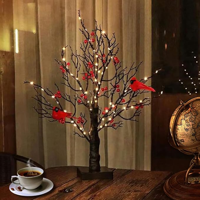 21in Black Birch Tree with 60 Led Lights, Twinkle Tree Lamp with Lighted Branches, Fairy Light Spirit Tree with 2 Red Birds for Room Decor, Easter, Halloween, Thanksgiving, Christmas, New Year, etc.