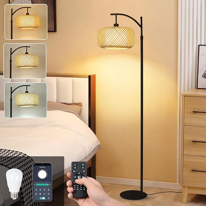Arc Floor Lamps, Bamboo Floor Lamp with Remote & Dimmable LED Bulb, Boho Rattan Pole Lamps with Bamboo & Fabric Shades, Rustic Standing Lamps for Living Room Bedroom Tall Reading Light