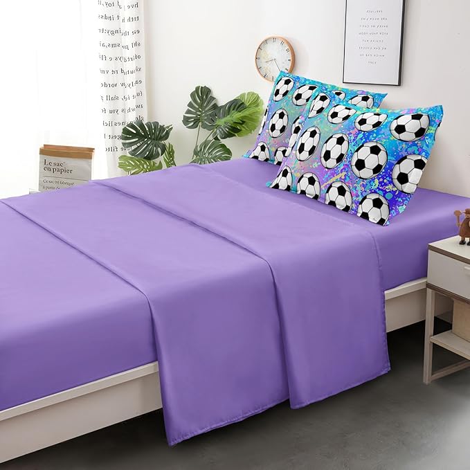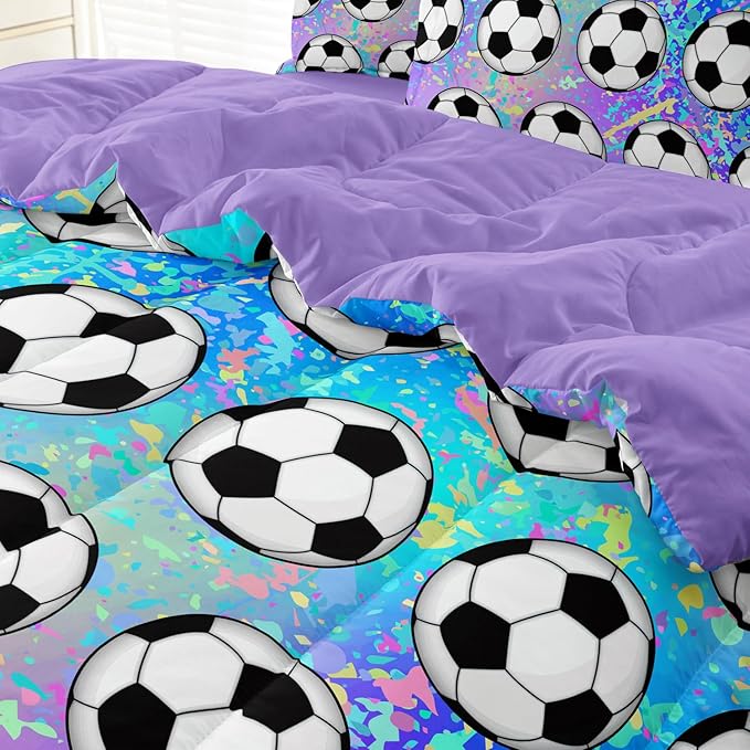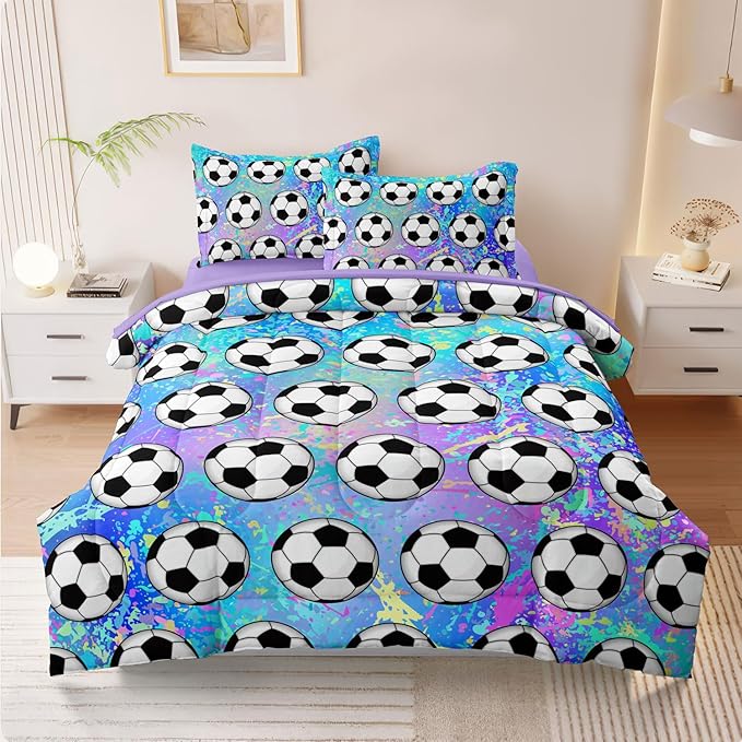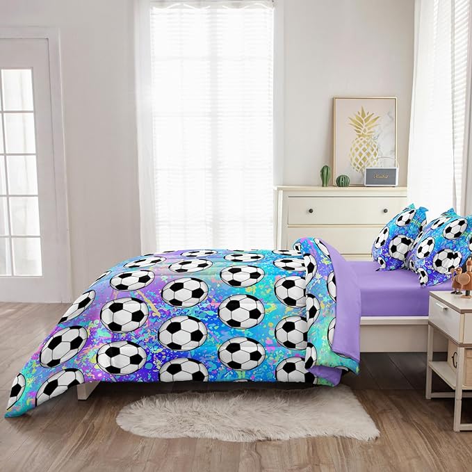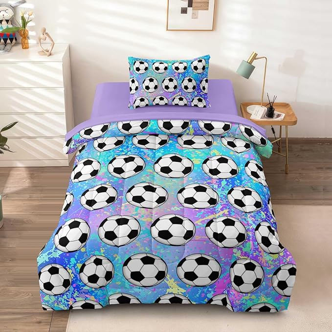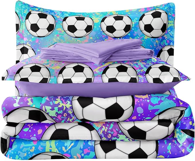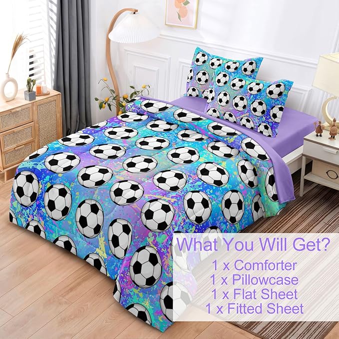 4 Piece Girls Soccer Bedding Set Twin Size Colorful Soccer Comforter Set for Teen Girls Kids Twin Bed in a Bag Set with Sheets Twin Bed Sets for Teenage