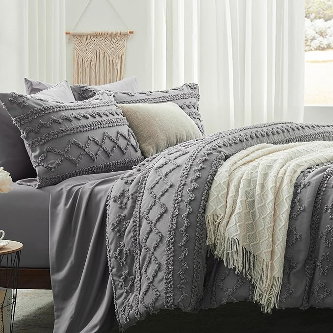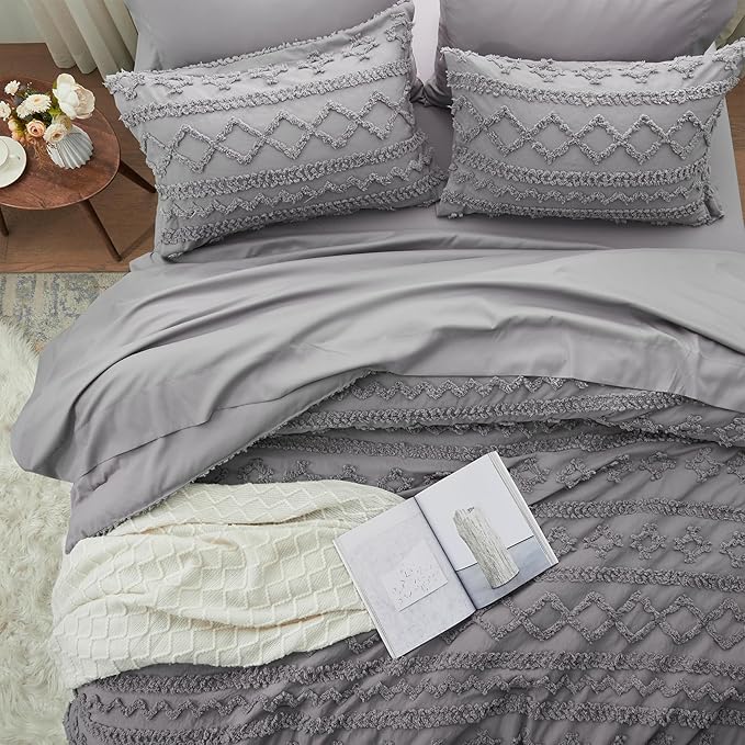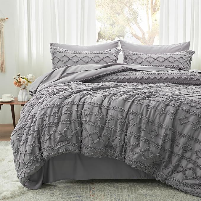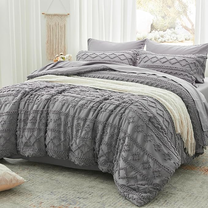 Anluoer Queen Comforter Set 7 Pieces, Grey Tufted Bed in a Bag with comforters and sheets, All Season Bedding Sets with 1 Comforter, 2 PillowShams, 2 Pillowcases, 1 Flat Sheet, 1 Fitted Sheet
