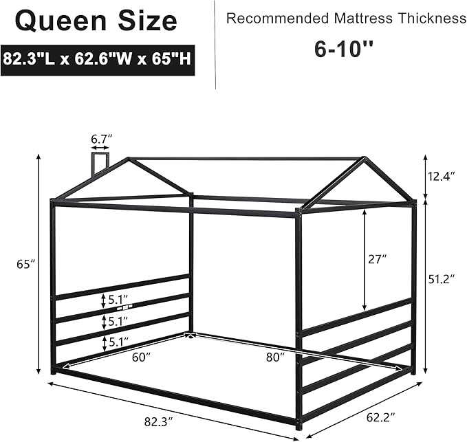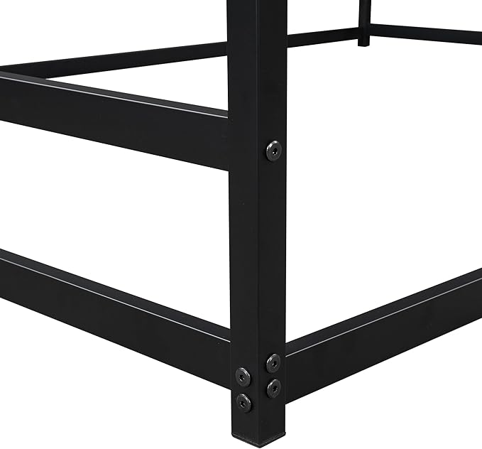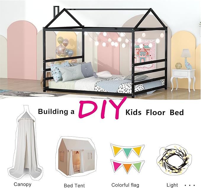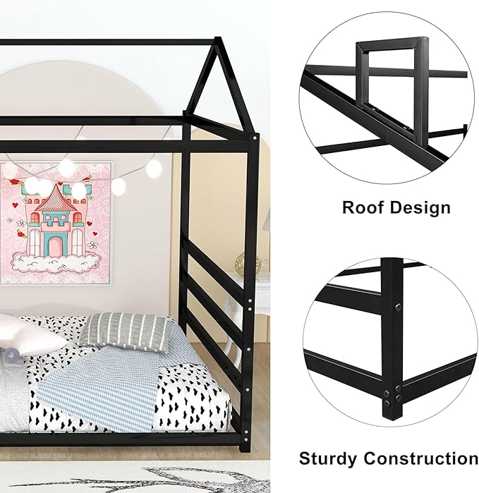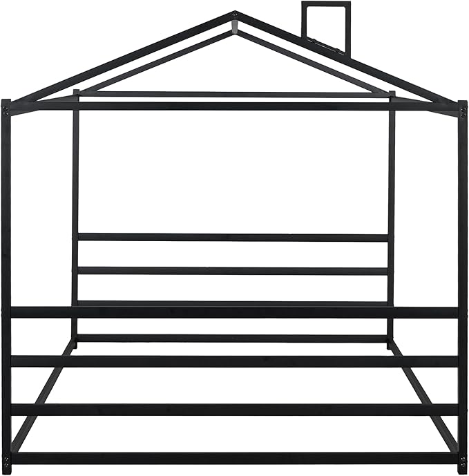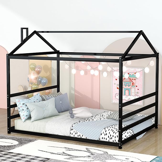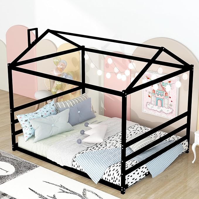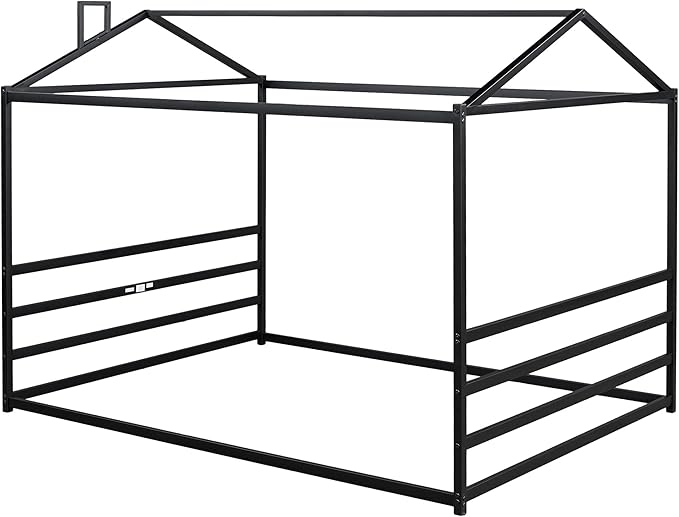 Bellemave Queen Size Metal Floor Bed for Kids,Montessori Floor Bed with Roof,House Bed for Boys Girls,Metal House Shape Platform Bed,Black