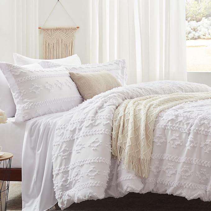 Anluoer Full Comforter Set 7 Pieces, White Tufted Bed in a Bag with comforters and sheets, All Season Bedding Sets with 1 Comforter, 2 PillowShams, 2 Pillowcases, 1 Flat Sheet, 1 Fitted Sheet