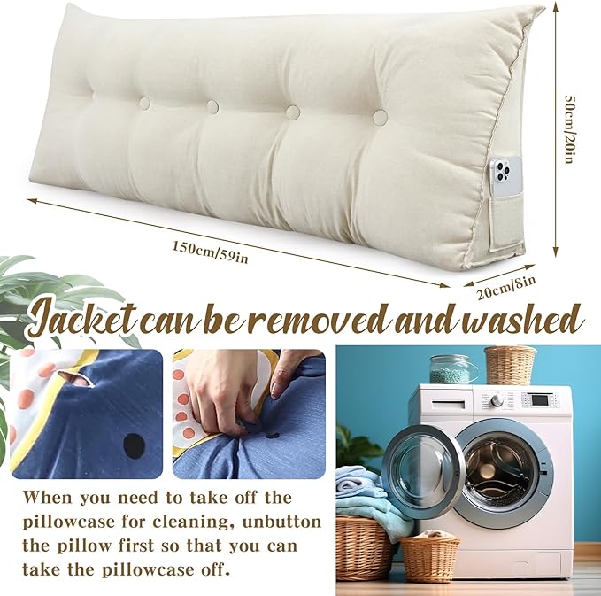 Headboard Wedge Pillow Triangular Bed Rest Reading Backrest Body Bolster Cushion Back Support Long Bolster Pillow for Bed Gifts with Removable Cover(Beige, Queen (59 x 20 x 8 Inch))