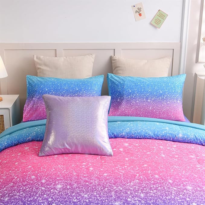 A Nice Night 6Pcs Gradient Glitter Bedding Set for Girls Queen Size, Colorful Rainbow Galaxy Comforter Set, Ultra Soft Bedding Sets, Blue