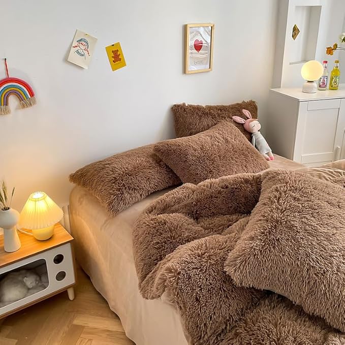 Faux Fur Kids Girls Coffee Comforter Sets Queen - 3PC Bed Set Warm Comfortable Soft Plush Flannel Velvet Fluffy Fuzzy Bedding(Comforter x 1 Pillowcases x 2)