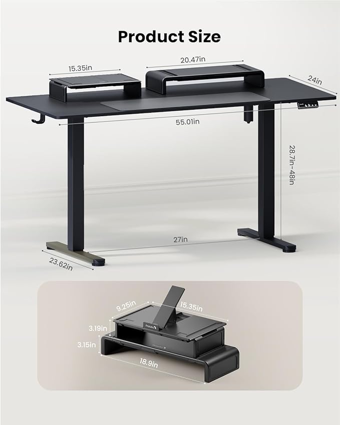 ProtoArc Standing Desk with Dual Monitor Stand Riser, 55 x 24 Inches Height Adjustable Desk with Storage, Electric Stand up Desk with Laptop Stand (Black/White)