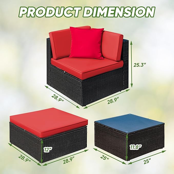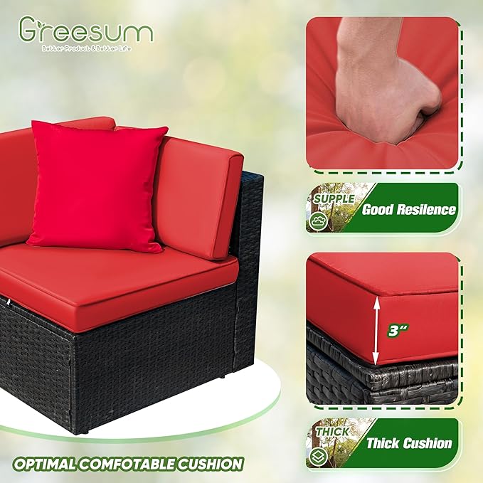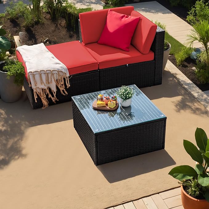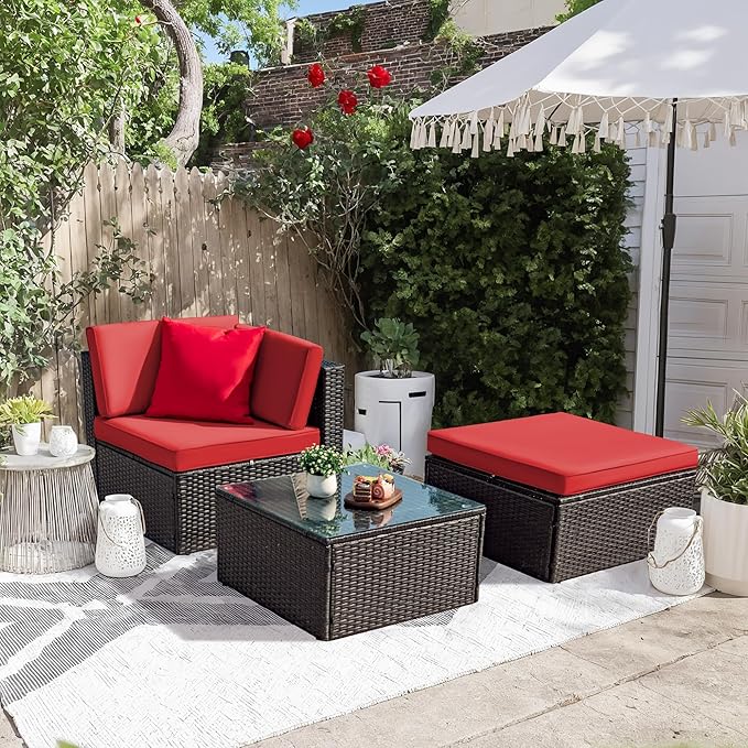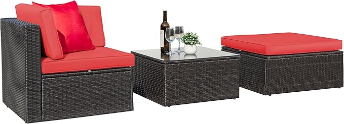 Greesum 3 Piece Patio Conversation Set Wicker Rattan Furniture Outdoor Sofa with Cushions,Pillows & Glass Table for Porch,Lawn and Yard, Red