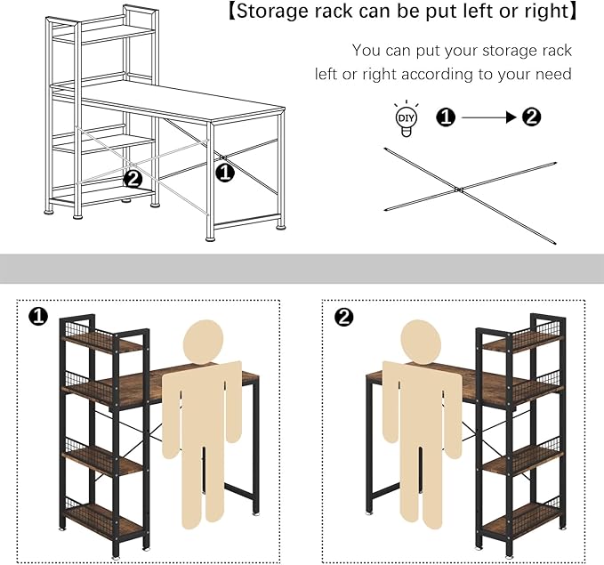 4NM 35" Small Computer Desk with 4-Tier Bookshelf and 8 Hooks, Home Office Desk Writing Workstation Study Table for Small Space Work - Rustic Brown and Black