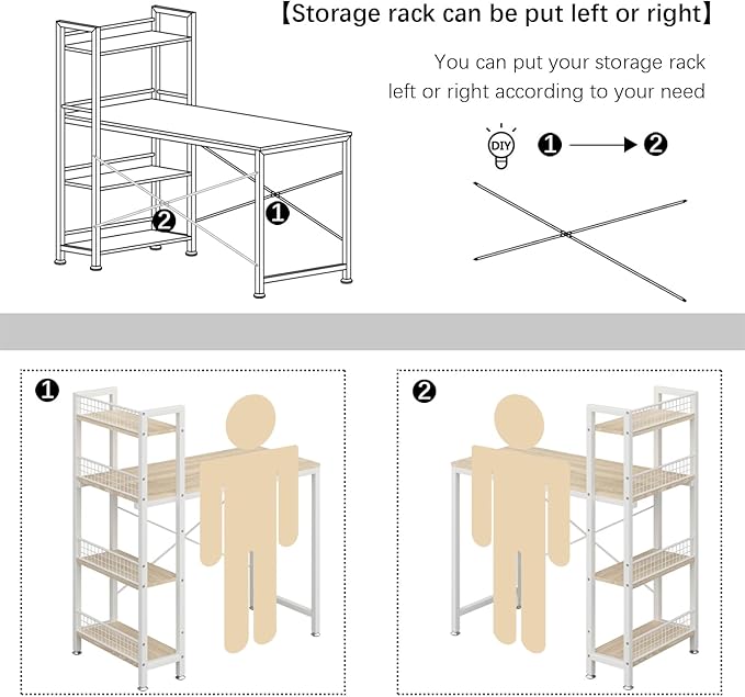 4NM 35" Small Computer Desk with 4-Tier Bookshelf and 8 Hooks, Home Office Desk Writing Workstation Study Table for Small Space Work - Natural and White
