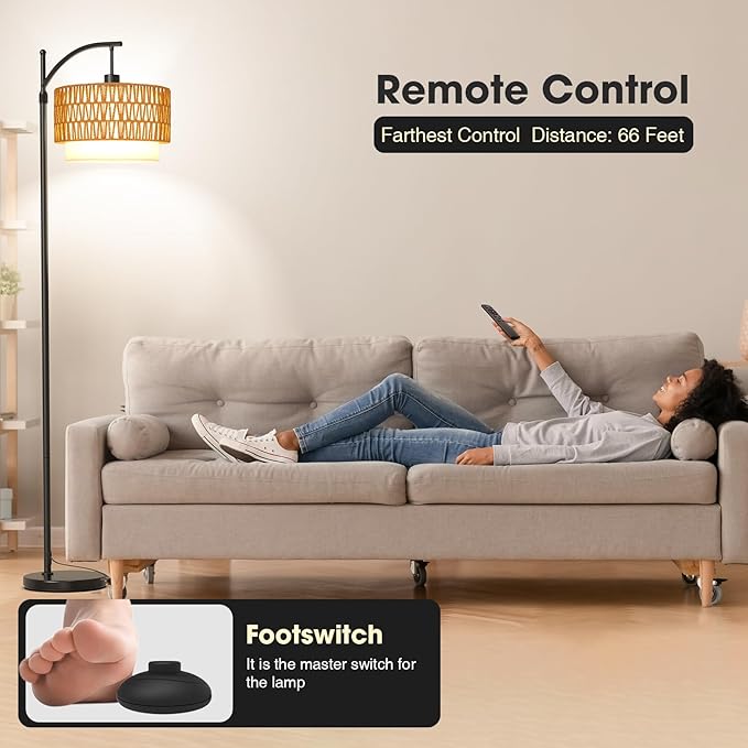 Arc Floor Lamp with 10 Color Temperatures, 10 Brightness, Remote & App Control, Boho Tall Standing Lamps with Smart Bulb, Rattan & Fabric Double Drum Shade for Living Room, Bedroom, Home Office