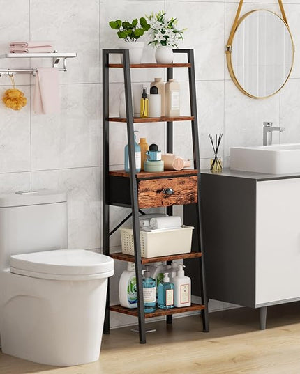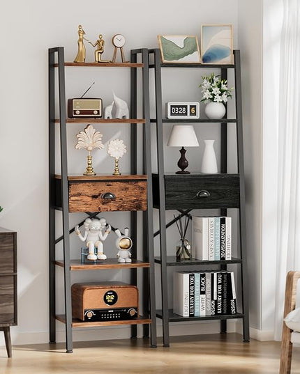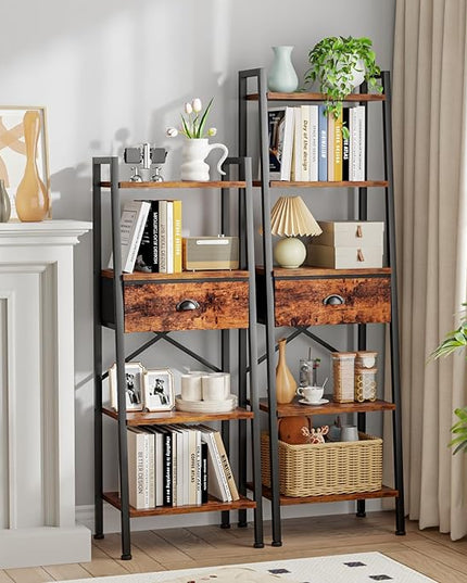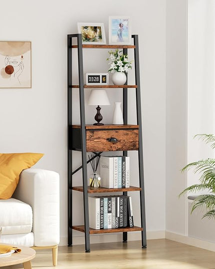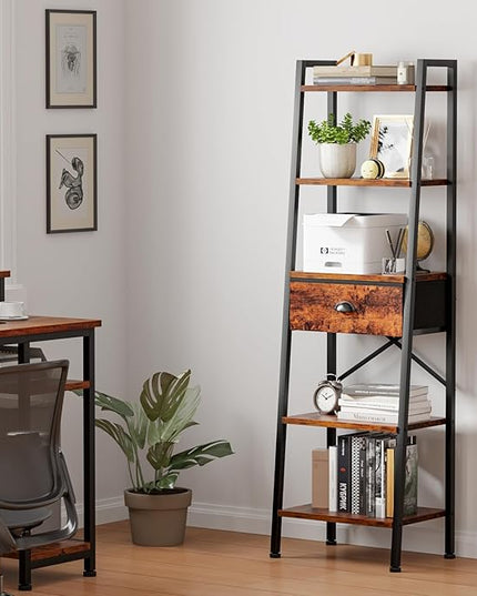 Furologee 5 Tier Ladder Shelf with Drawer, Tall Bookshelf Storage Shelves, Bookcase Standing Shelf Units, Industrial Open Display Shelves Organizer for Bedroom, Living Room, Kitchen, Rustic Brown…