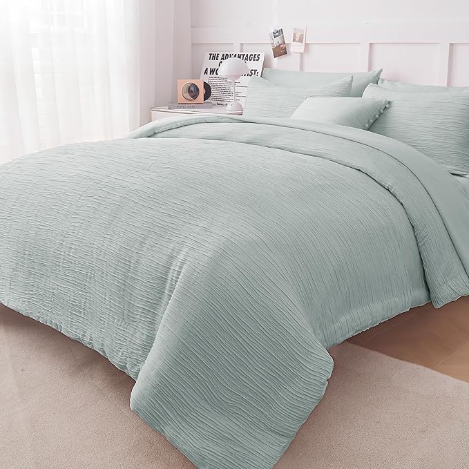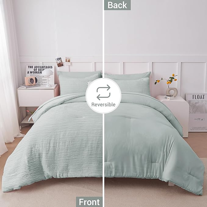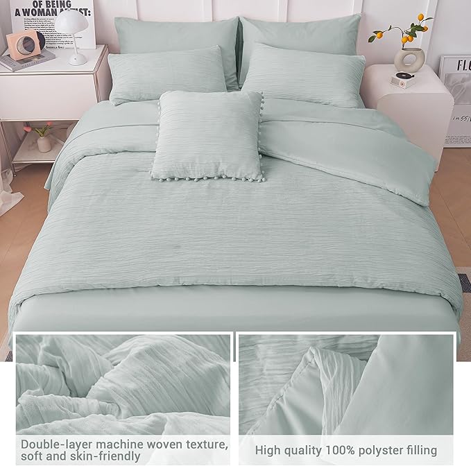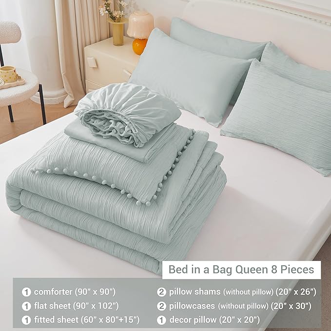 8 Piece Woven Texture Sage Green Comforter Set Queen, Bed in A Bag Bedding Sets Queen with Comforter and Sheets, Soft Lightweight Comforter Set with Deocor Throw Pillow, Green