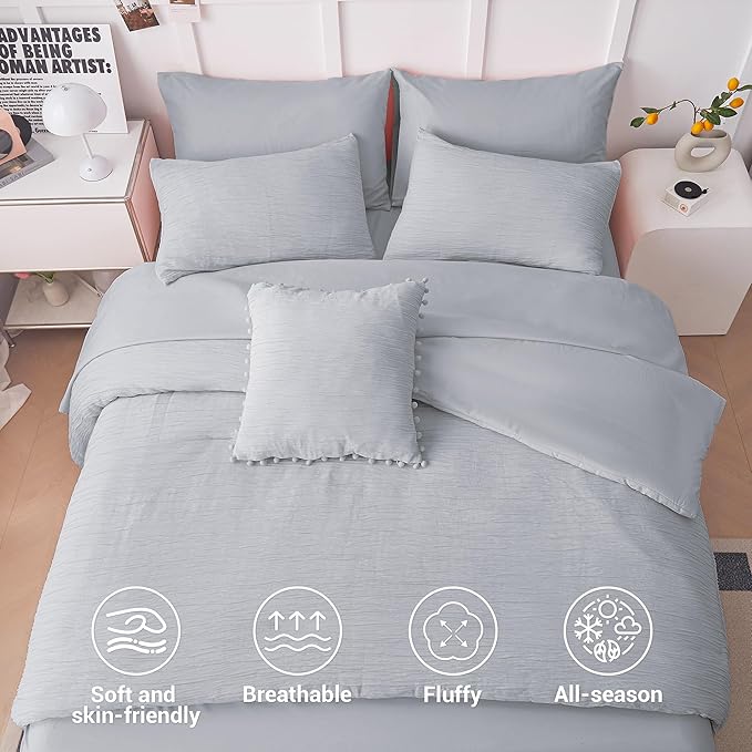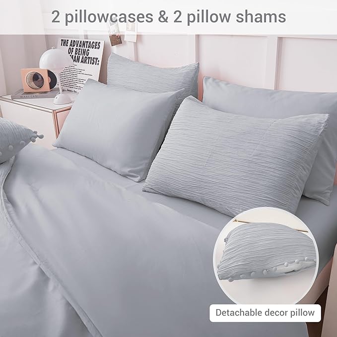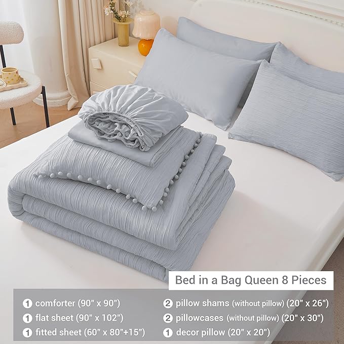 8 Piece Woven Texture Grey Comforter Queen Size, Bed in A Bag Bedding Sets Queen with Comforter and Sheets, Soft Lightweight Comforter Set with Deocor Throw Pillow, Grey