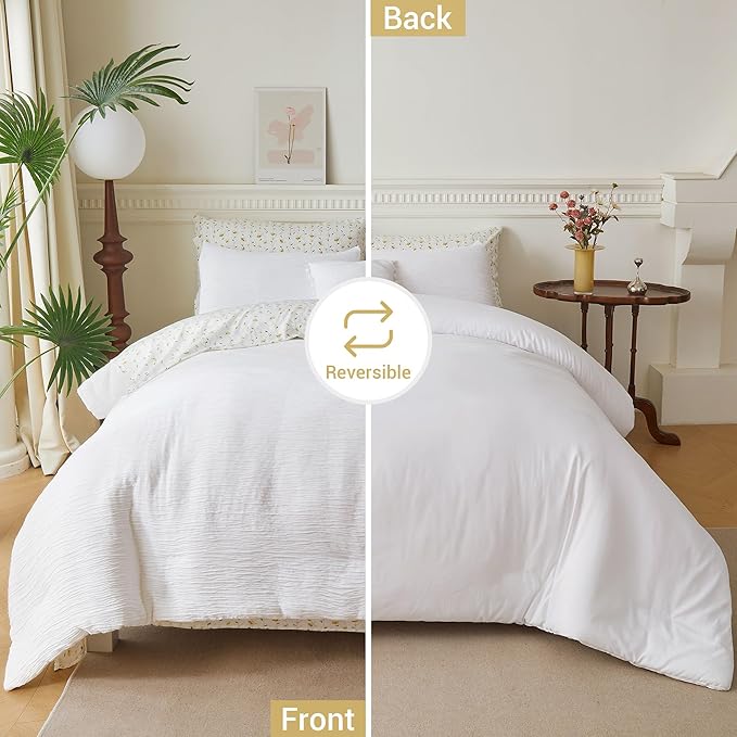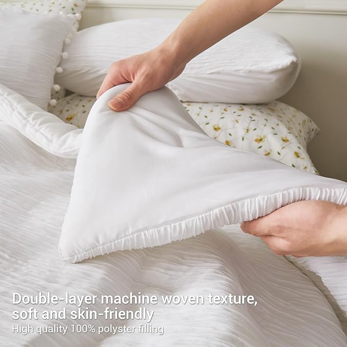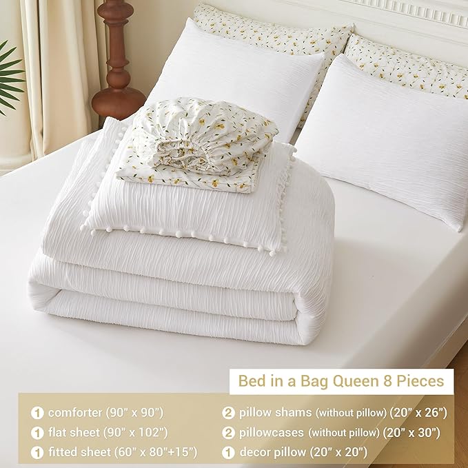 8 Piece Woven Texture White Comforter Set Queen, Bed in A Bag Bedding Sets Queen with Comforter and Sheets, Soft Lightweight Comforter Set with Deocor Throw Pillow, White