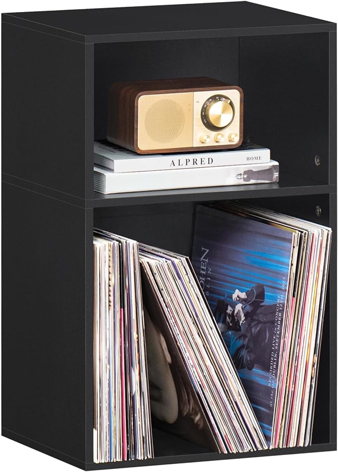 YAHARBO 2 Cube Bookshelf, Black Record Player Stand with Vinyl Storage Up to 100 Albums, Horizontal Book Shelf, Small Cubby Bookcase with Storage Organizer, Turntable Stand for Living Room, Bedroom