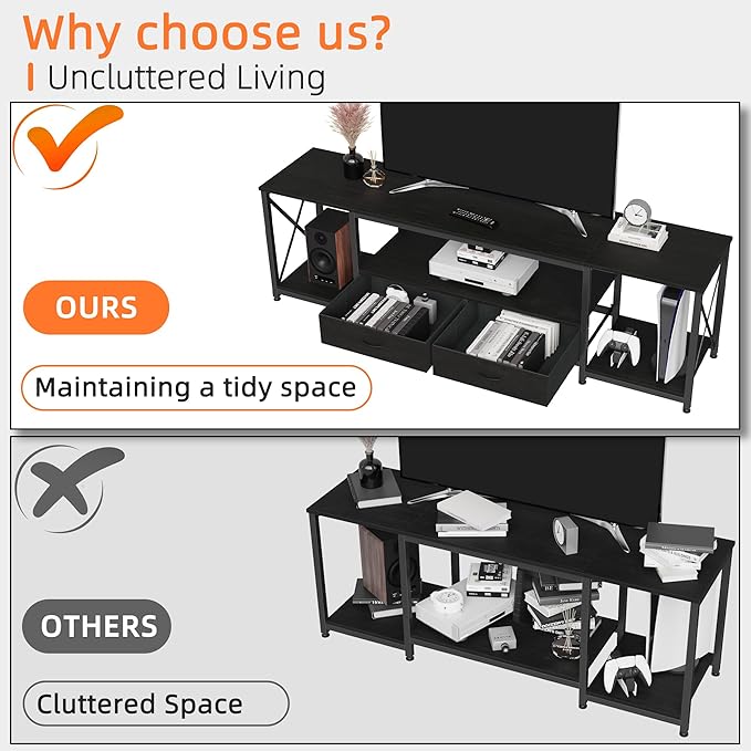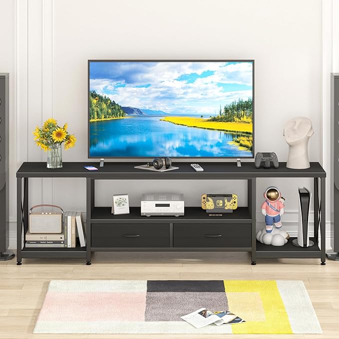 TV Stand with Fabric Drawers for 75 80 Inches TV - Entertainment Center and Industrial TV Console Table with Open Storage Shelves for Living Room, Bedroom- 71.5" Black