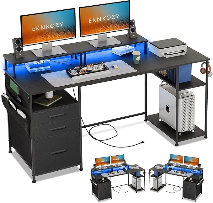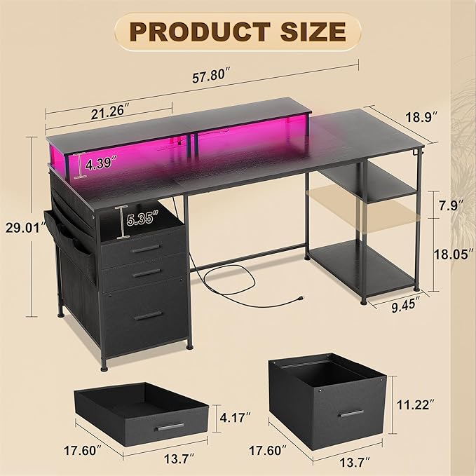 Computer Desk with 3 File Cabinet Drawers, 57.8'' Reversible Gaming Desk with LED Lights and Power Outlets, Office Desk with Storage Shelves and Dual Monitor Stand for Home & Office (Black)