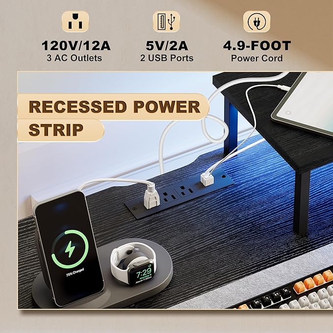 About This Power Outlet & LED Lights: This large computer desk features built-in LED lighting with 20 static colors, 22...