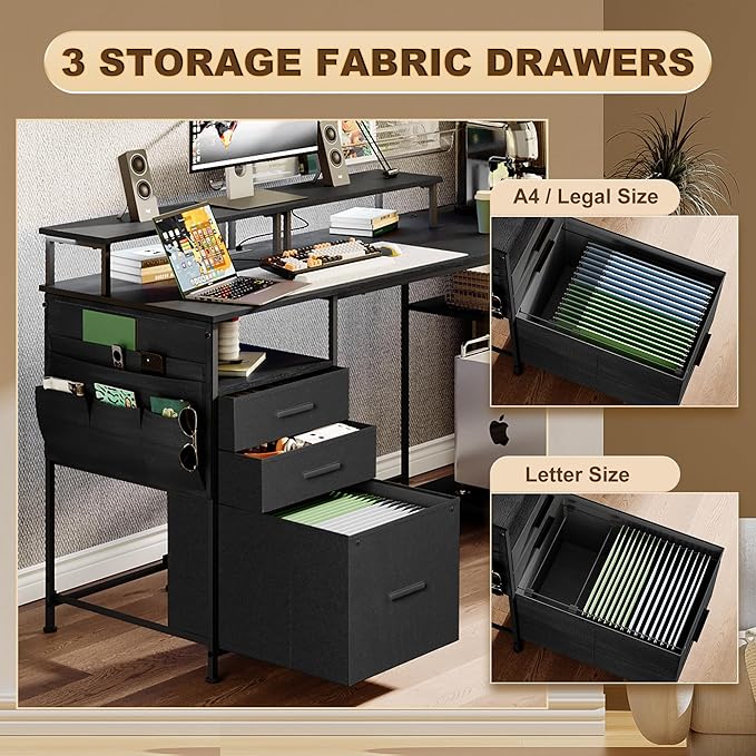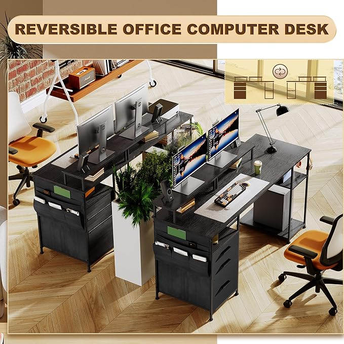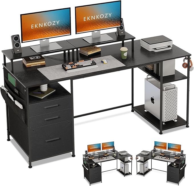 Computer Desk with 3 File Cabinet Drawers, 57.8'' Reversible Gaming Desk, Office Desk with Storage Shelves and Dual Monitor Stand for Home & Office (Black)