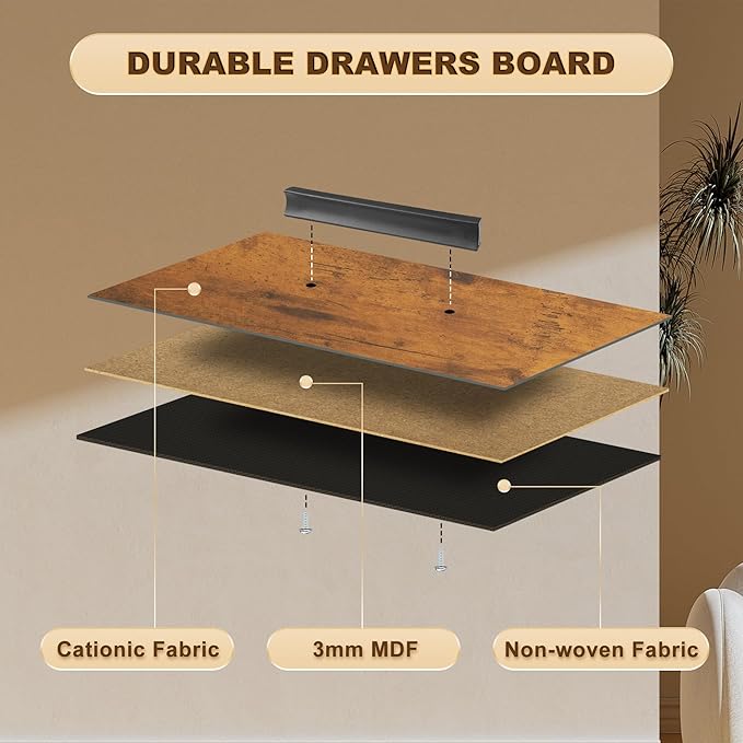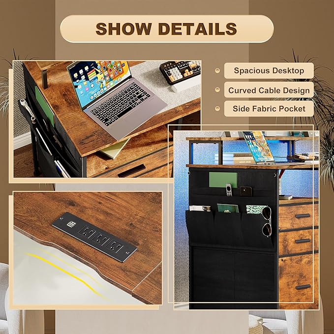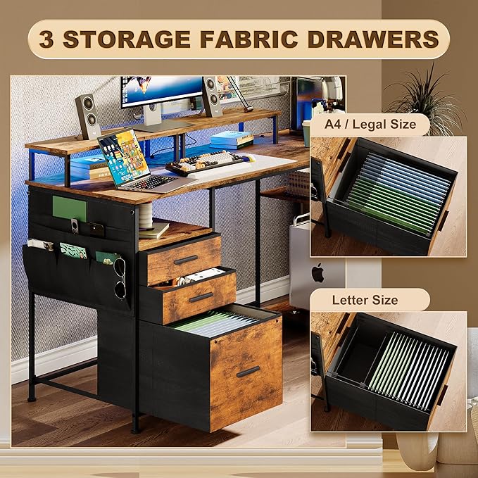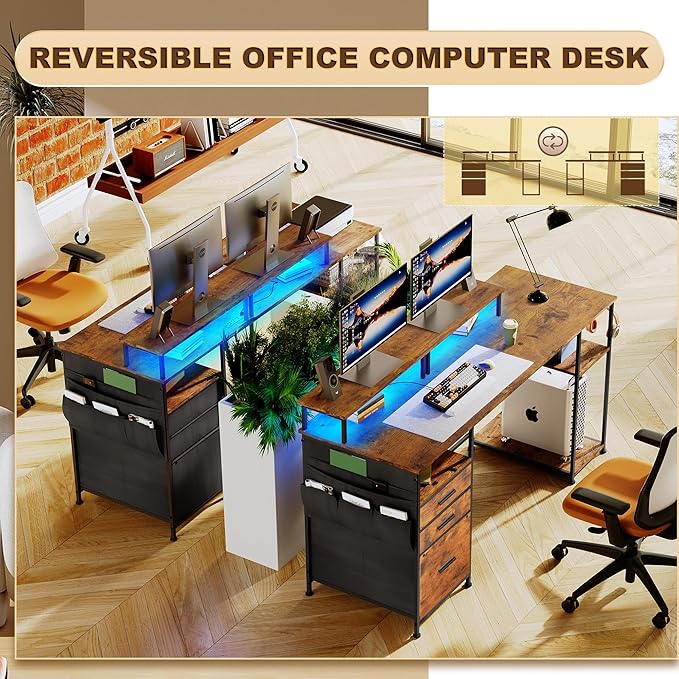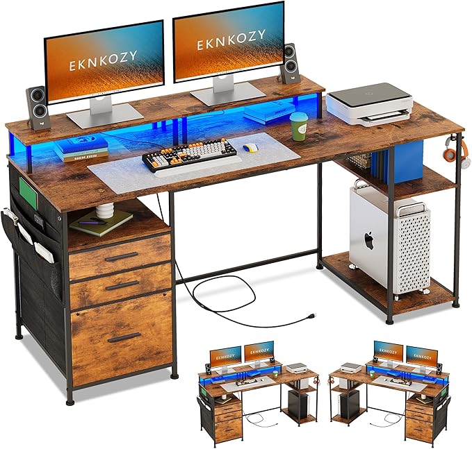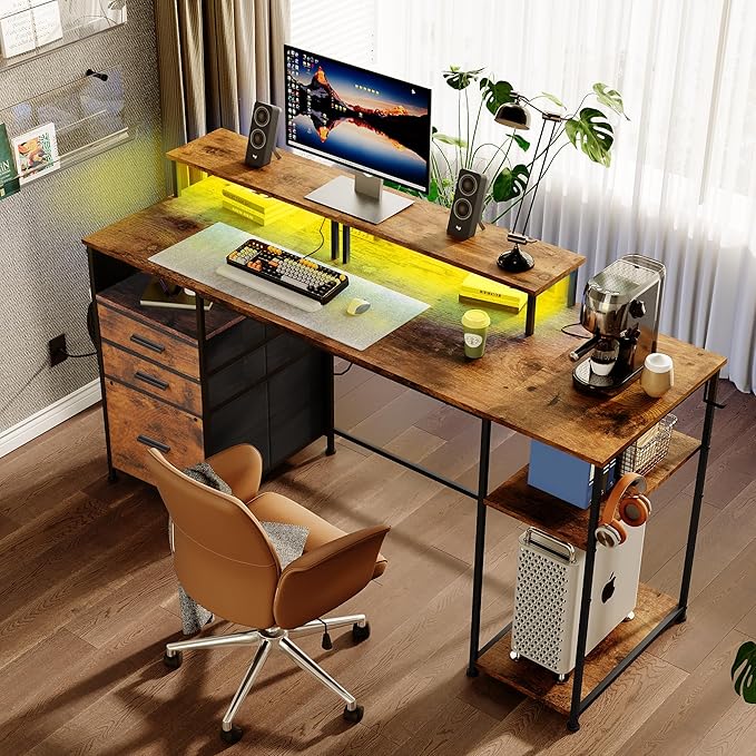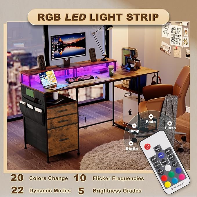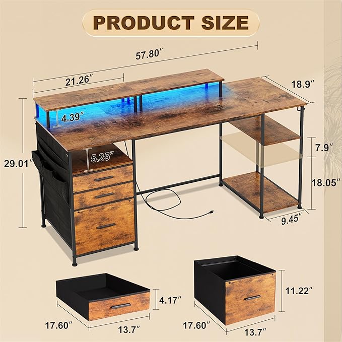 Computer Desk with 3 File Cabinet Drawers, 57.8'' Reversible Gaming Desk with LED Lights and Power Outlets, Office Desk with Storage Shelves for Home & Office (Rustic Brown)