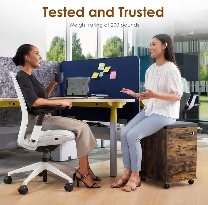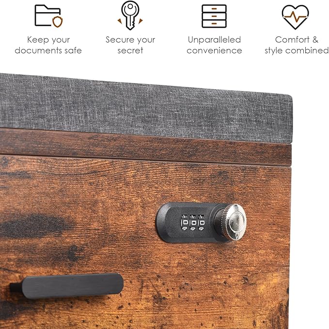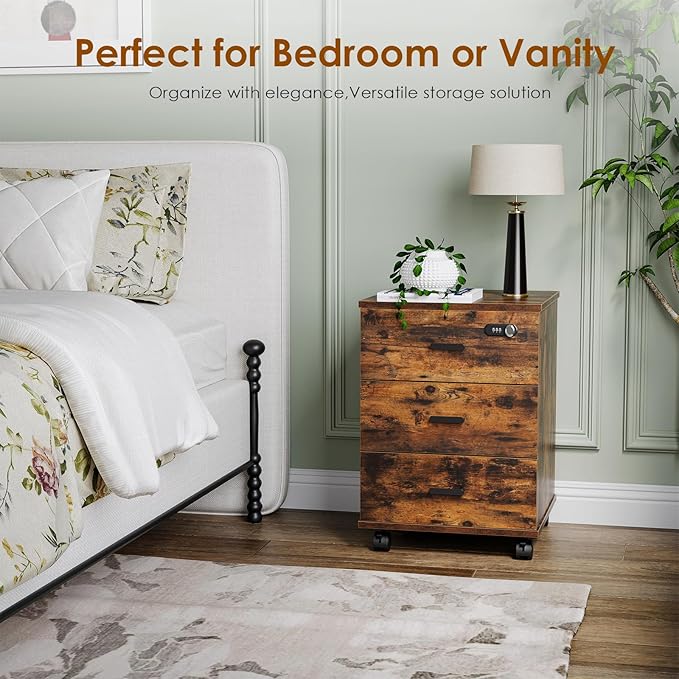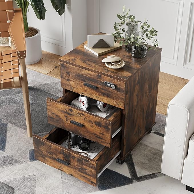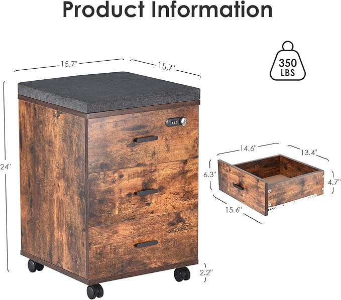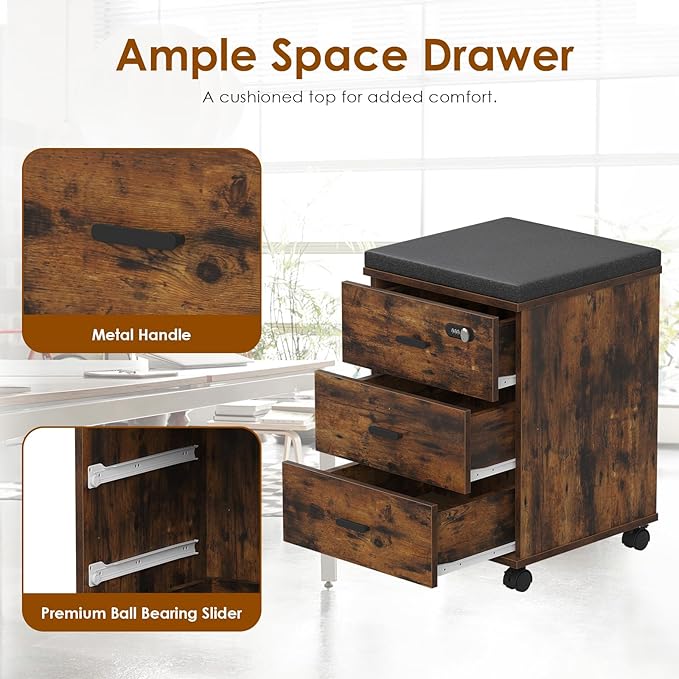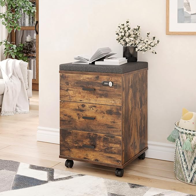 Soohow 3 Drawers Vertical Detachable Cushion Mobile Under Desk File Cabinet with Smart Lock/Casters,Rustic-Black, Large, Brown