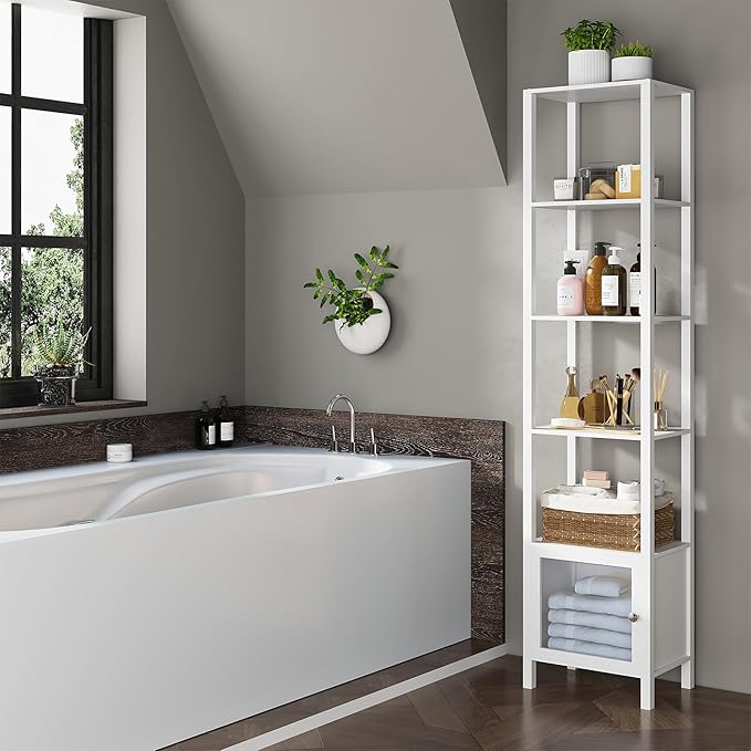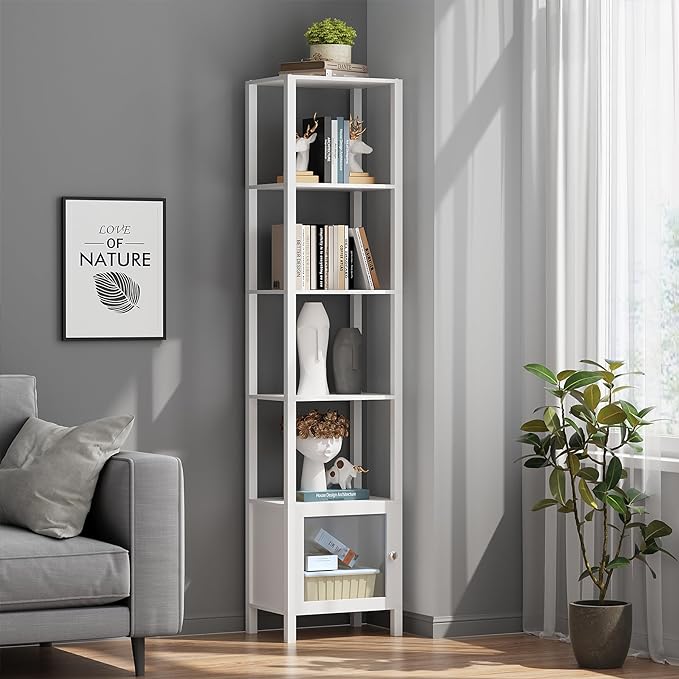 TUTOTAK 6 Tier Bookcase and Bookshelf, Narrow Book shelf with Door for Small Space, for Living Room, Office, Study, Entryway, White BS03BW006