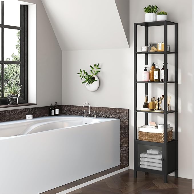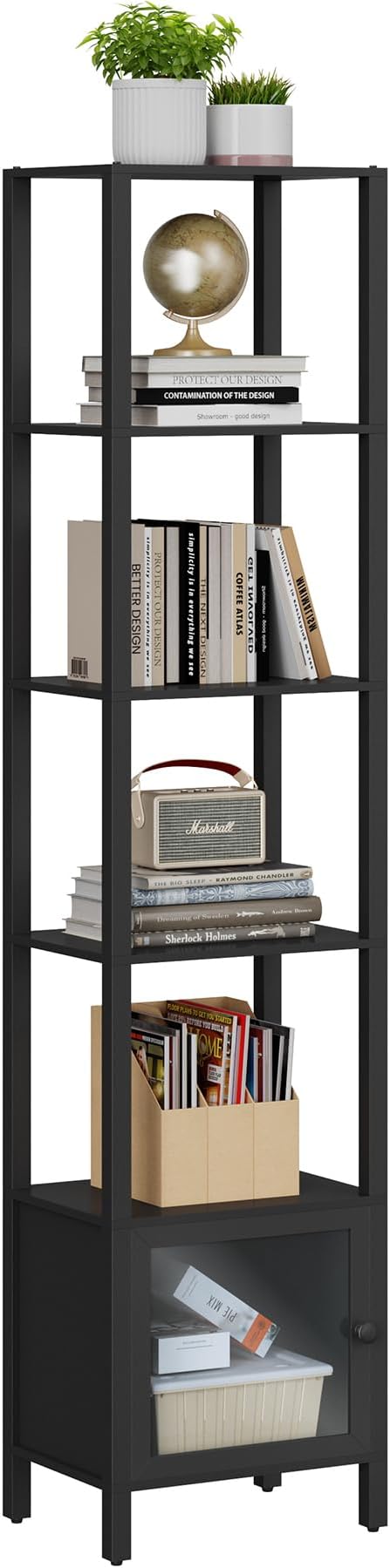 TUTOTAK 6 Tier Bookcase and Bookshelf, Narrow Book shelf with Door for Small Space, for Living Room, Office, Study, Entryway, Black BS03BK006
