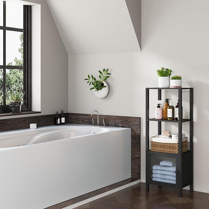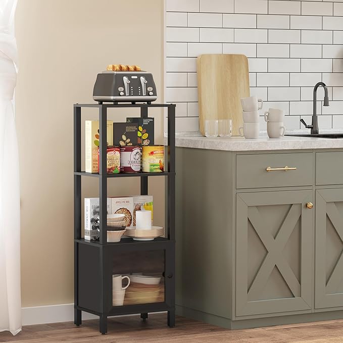 TUTOTAK 4 Tier Bookcase and Bookshelf, Narrow Book shelf with Door for Small Space, for Living Room, Office, Study, Entryway, Black BS03BK004