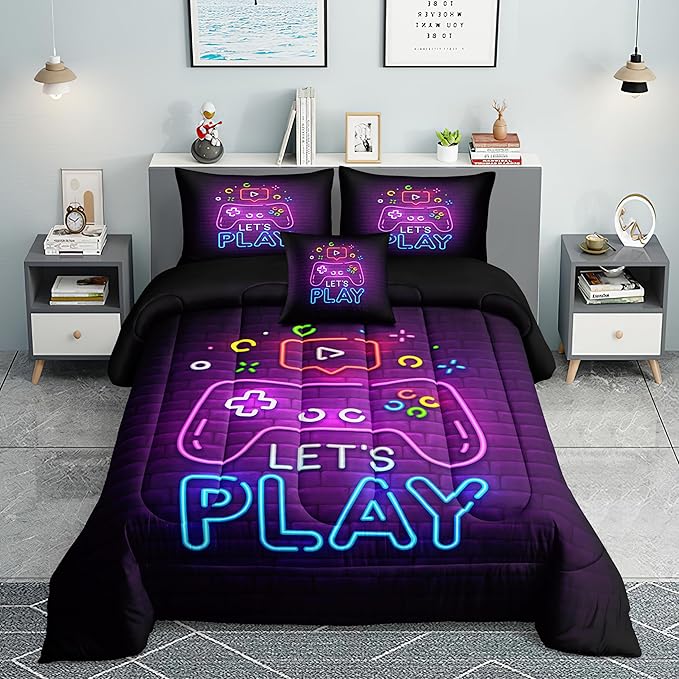 6 PCS Gamer Bedding Sets,Gaming Comforter Set for Boys,Kids Bedding Sets for Boys,Full Size Bedding Sets for Boys,Bed in A Bag with Sheets(Full,Pink Color)