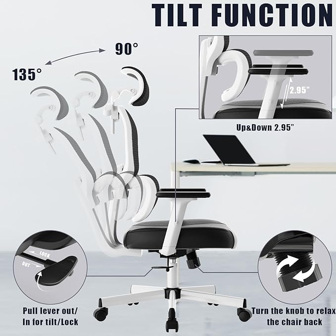 • 【Experience Luxury and Durability】: Crafted with PU Leather, the seat cushion is soft, supportive, and resistant to deformation. This mesh ergonomic office chair includes adjustable height, lumbar support, and a headrest to prevent spine and muscle fatigue, ensuring maximum comfort during long workdays.