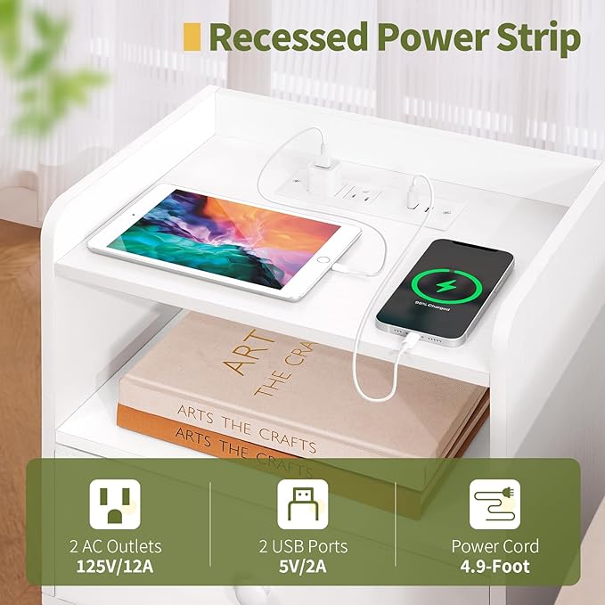 • 🔋【Charging Is A Breeze!】Meet the Yoobure wood nightstand – your solution to outlet shortages! The bed side table is equipped with 2 AC power outlets and 2 USB ports that can fully satisfy your charging needs. Moreover, efficiently charges multiple devices with well-placed outlets on the white night stand, no interference.