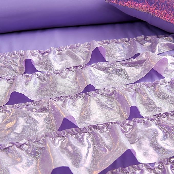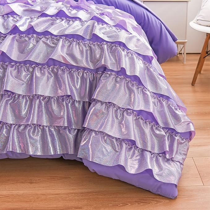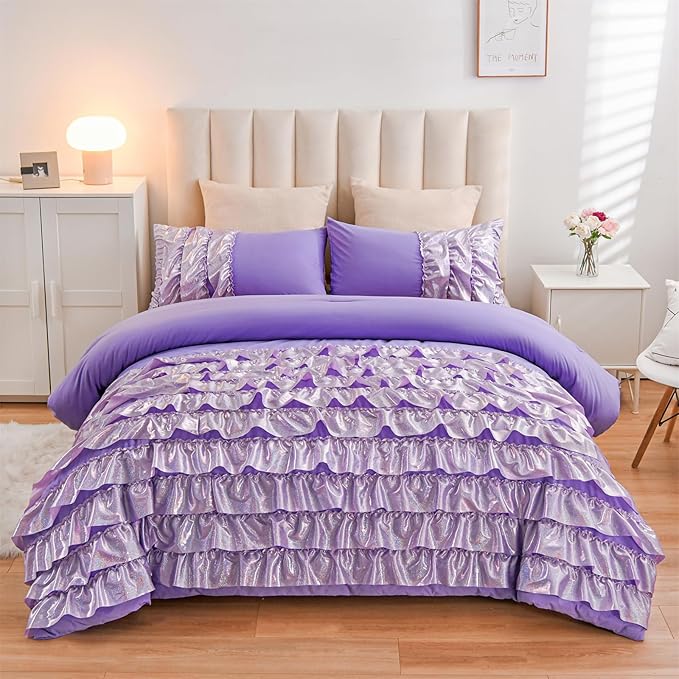A Nice Night Waterfall Flutter Ruffle 3PCS Comforter Set,Chic Ruffled Textured Princess Bedding Set,Bling Purple,Twin