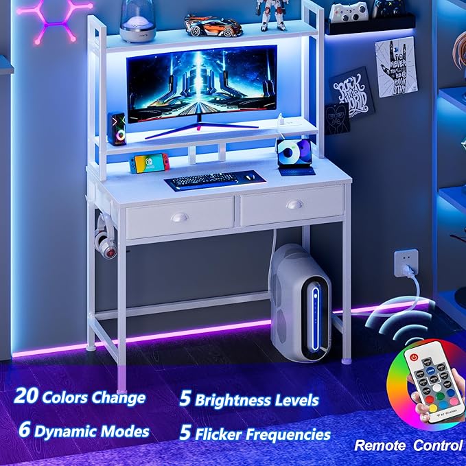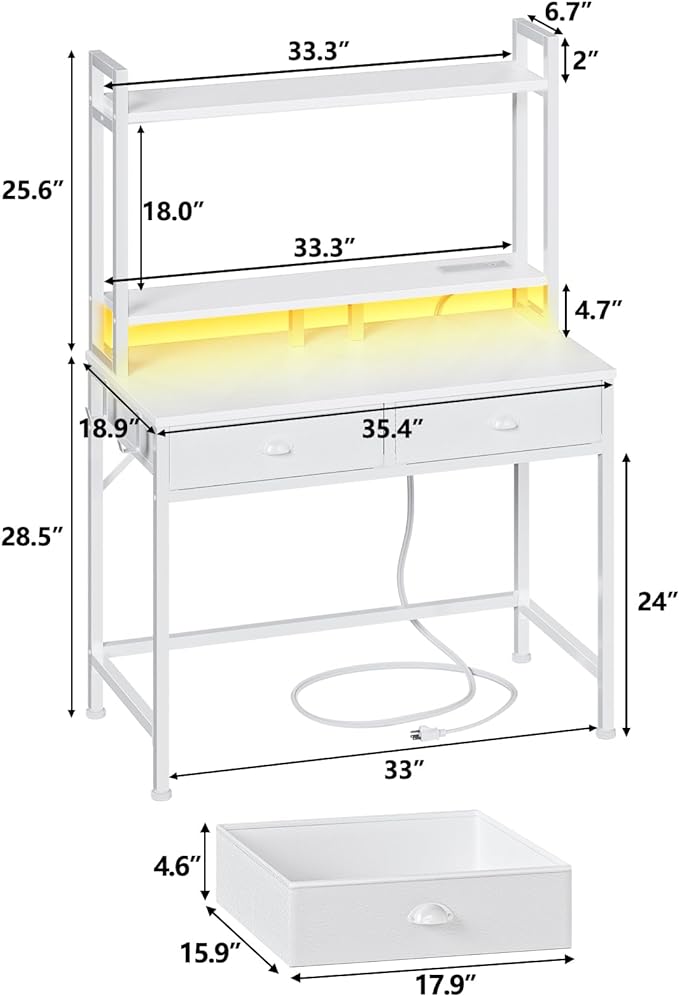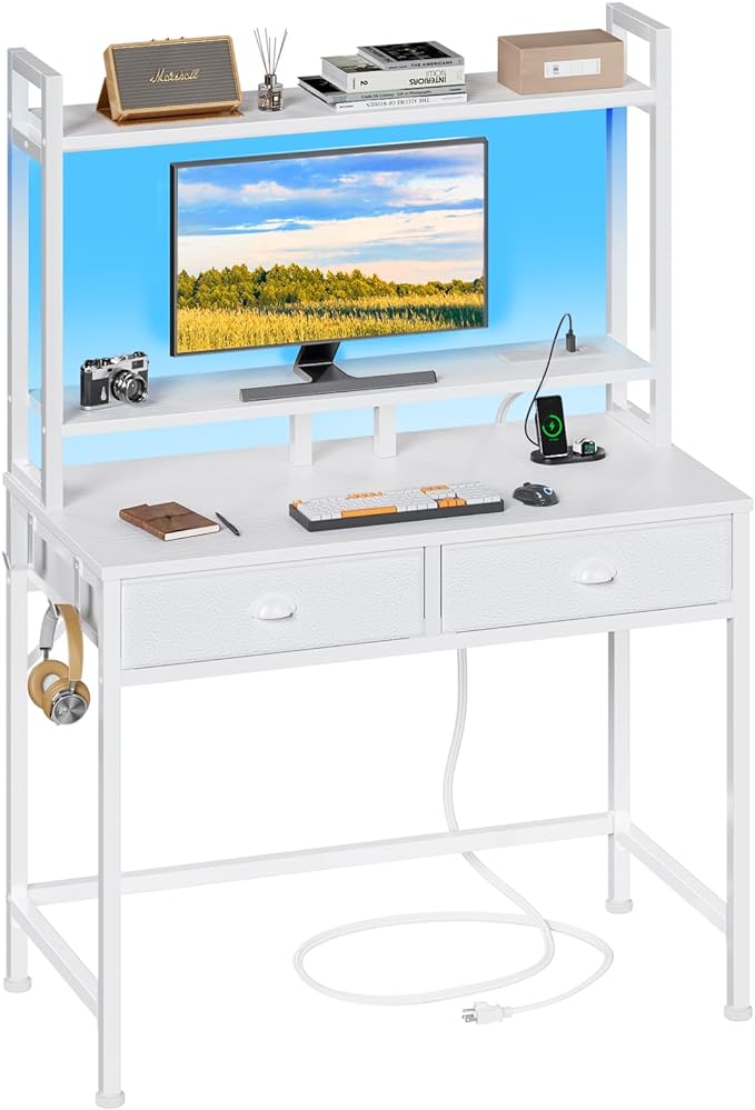 Furologee Small White Computer Desk with Power Outlet and 2 Fabric Drawers, Gaming Desk with LED light, Home Office Desk with Monitor Stand and Hutch for Small Space Working, Study Table with Shelf