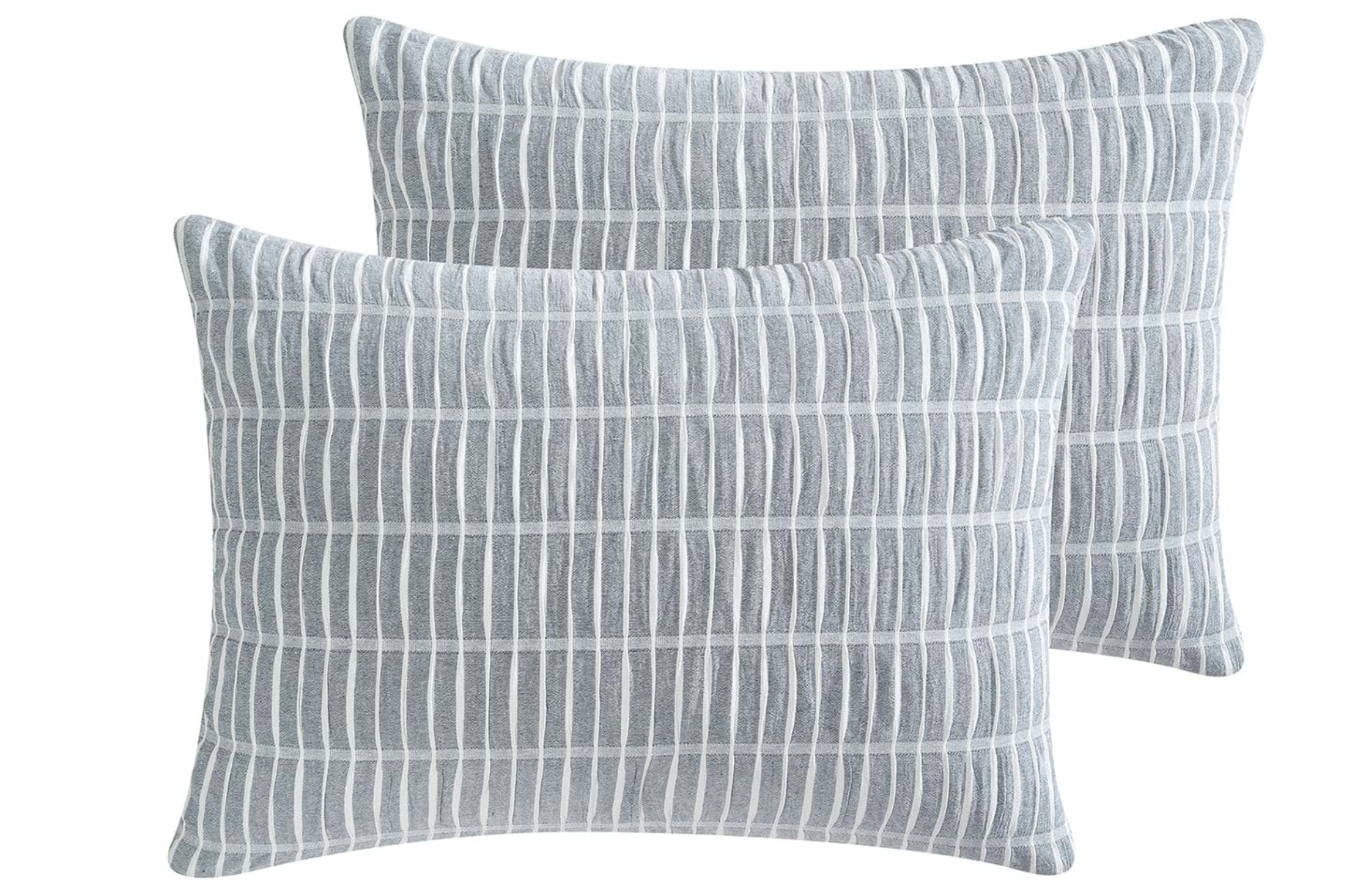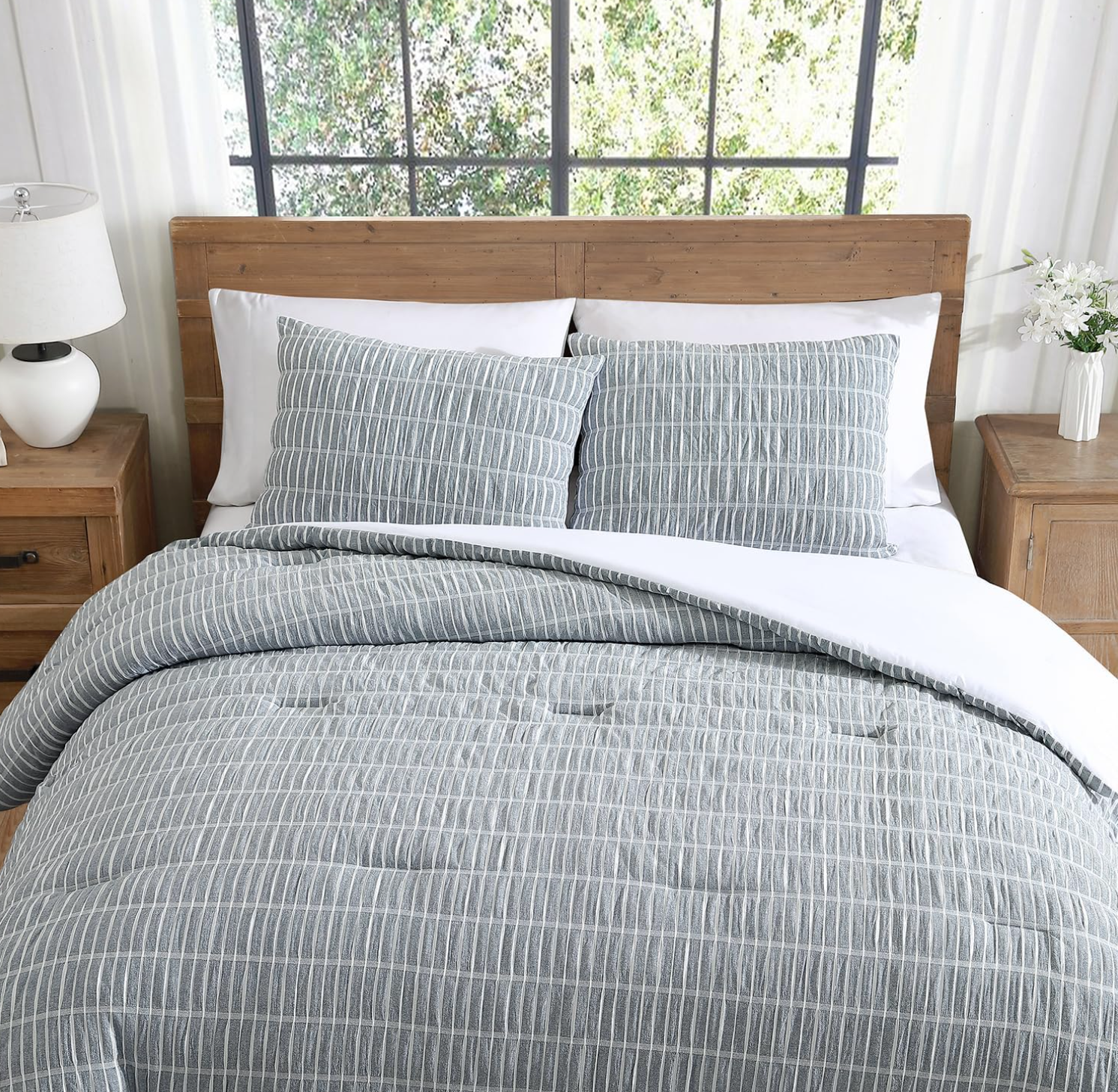 King 100% Cotton Comforter Set | Ivy Denim Blue Puckered Striped Down Alternative Comforter | All Season, Linen-Like, Textured 3 Piece Bedding Comforter Set (King, Ivy Denim Blue)