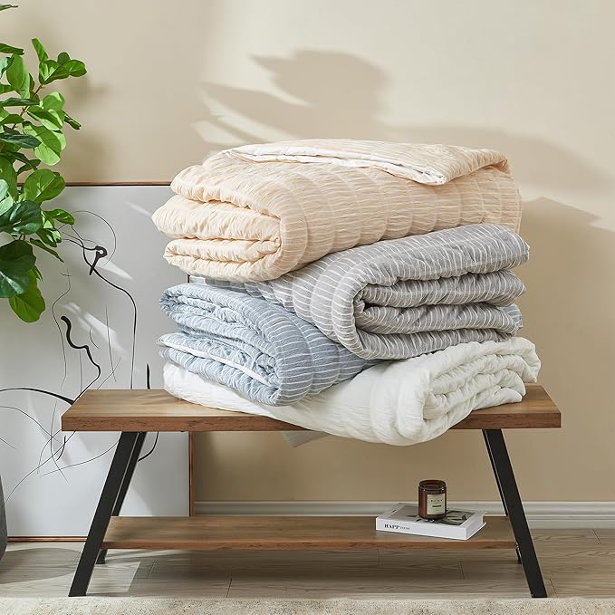 King 100% Cotton Comforter Set | White Puckered Striped Down Alternative Comforter | All Season, Linen-Like, Textured 3 Piece Bedding Comforter Set (King, White)