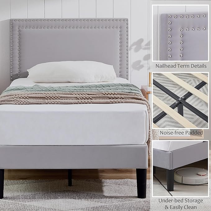• [NO BOX SPRING NEEDED] - Metal frame and 12 wood slats support platform to extend the life of your mattress, This upholstered bed frame suitable for all kinds of mattresses, spring, memory foam, latex, or hybrid mattress.Max Weight capacity: 500 lbs