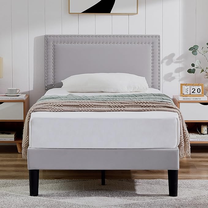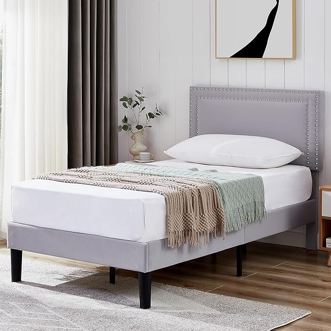 VECELO Twin Size Platform Bed Frame with Adjustable Upholstered Headboard, Modern Mattress Foundation, Strong Wood Slat Support, No Box Spring Needed, Easy Assembly