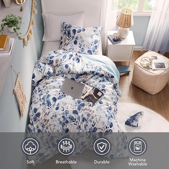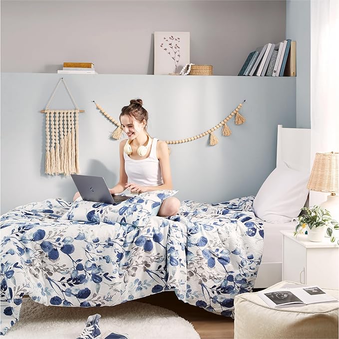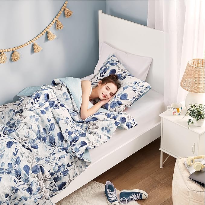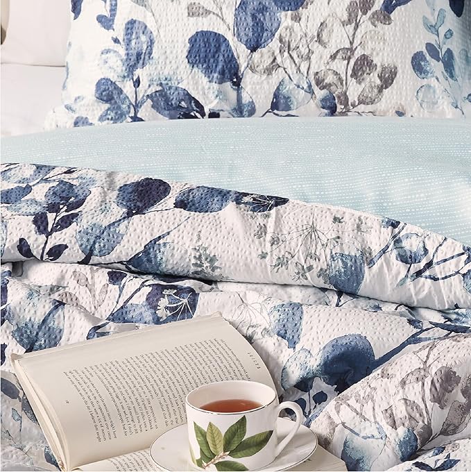 Codi Floral Twin Comforter Set for Teen Girls, Spring Lavender Bedding Sets with Soft Seersucker 2pcs - 1 Flower Comforters and 1 Pillows Case, Blue