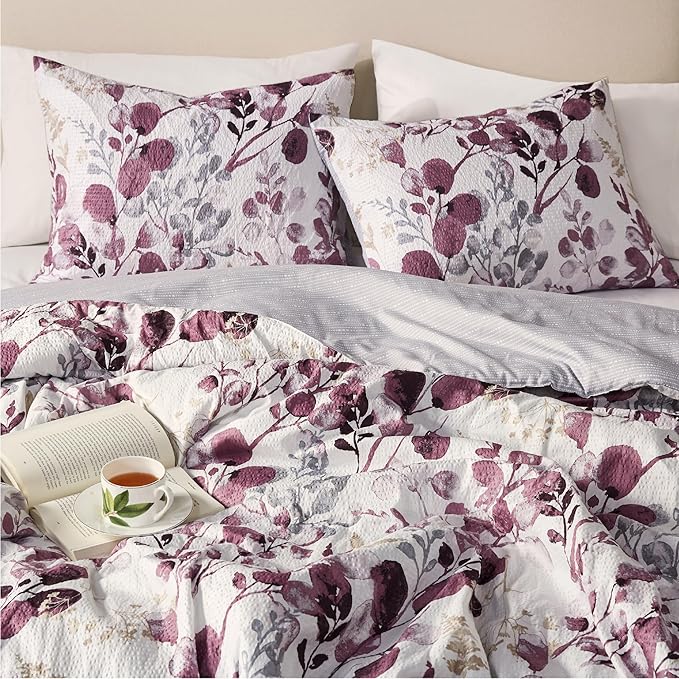 Codi Floral Queen Comforter Set for Womens, Spring Lavender Bedding Sets with Soft Seersucker 3pcs - 1 Flower Comforters and 2 Pillows Case, Lilac Purple
