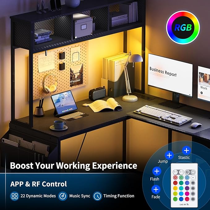 Yoobure L Shaped Desk Gaming Desk with LED Strip & Power Outlet, Reversible L-Shaped Computer Desk with Drawer, Corner Desk with Storage Shelf, 2 Person Home Office Desk, Carbon Fiber Black