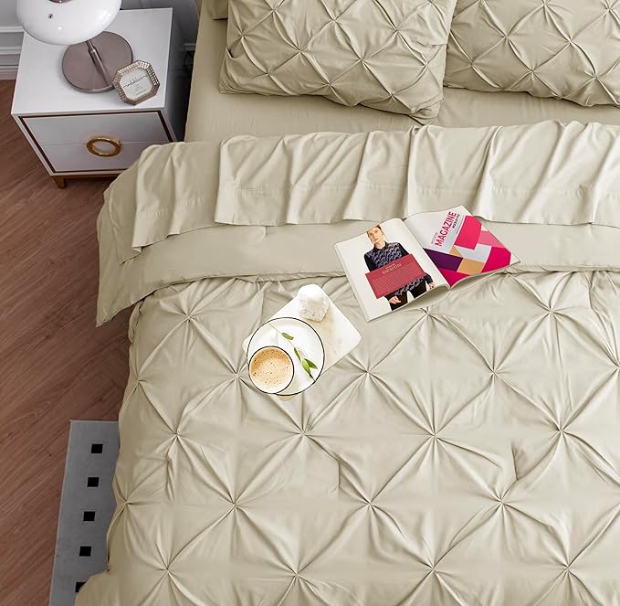 LANE LINEN California King Comforter Set, 7 Piece Cal King Bed in a Bag, Pintuck Cal King Bedding Set, Soft Cali King Bed Set, Cal King Bedding Comforter Sets with Sheets, Pillowcases & Shams - Linen