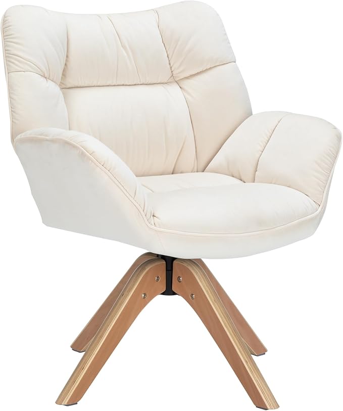 Fabric Accent Chair, Modern Cozy Vanity Chair with Wood Legs, Upholstered Single Boucle Armchair Single Sofa for Living Room Bedroom Office Guest Room Dining Room (Beige)